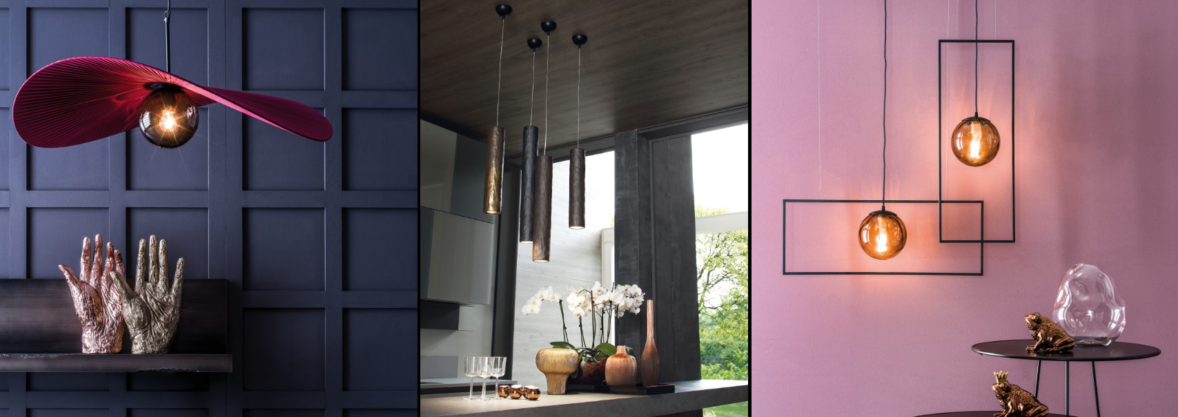 تتوج المجموعة بثلاث قطع إضاءة استثنائية تعيد تعريف مفهوم الإنارة المحيطية حيث الأبعاد التي تعكس الضوء والظل وتمنح العمق وتخلق نقطة محورية قوية في المساحات الداخلية العصرية